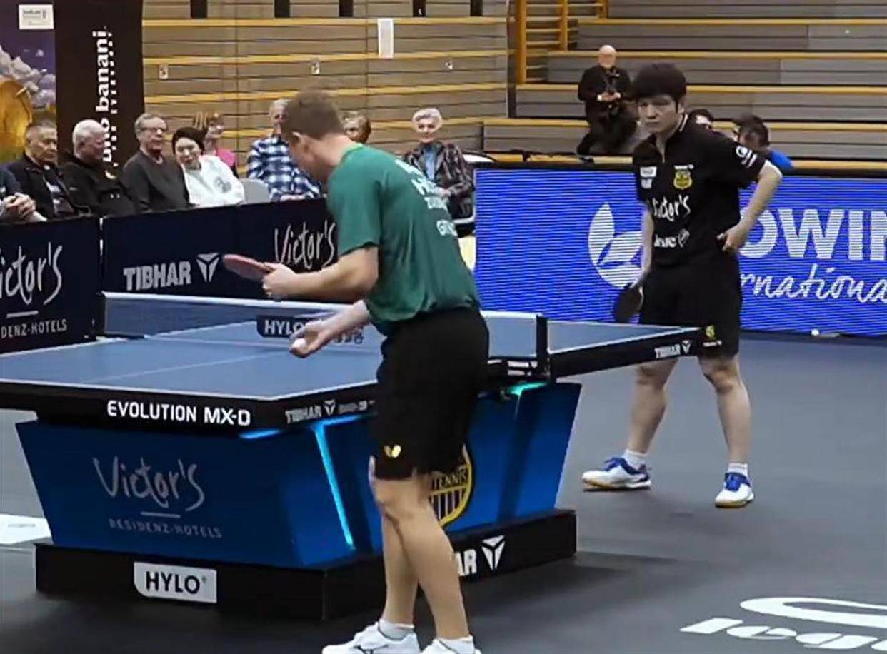 第四盘,他面对的对手出现了临场变化,格瑞扎队派出了39岁的德国前国家队主力鲍姆临时替补登场。 这位左手持拍的老将经验丰富,其旋转和线路变化对于任何对手都是一个考验。